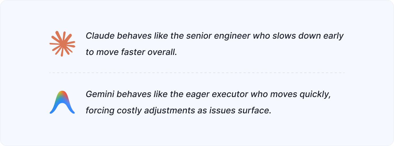 Claude Code approached the work with structure and alignment, reducing the critical, high-cost downstream corrections. Gemini moved faster and handled scaffolding well, but its velocity created a higher demand for explicit direction and deep-seated reasoning from the engineer.