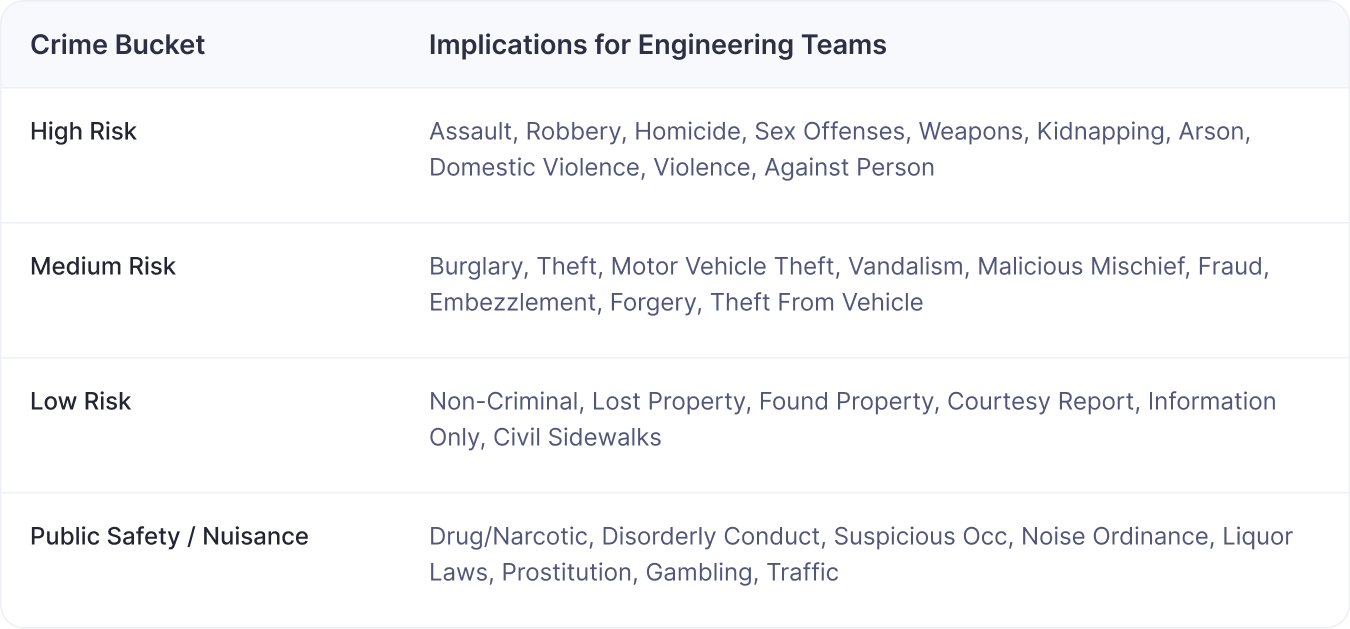 Here’s how we have grouped the crime categories into simpler buckets for understanding: