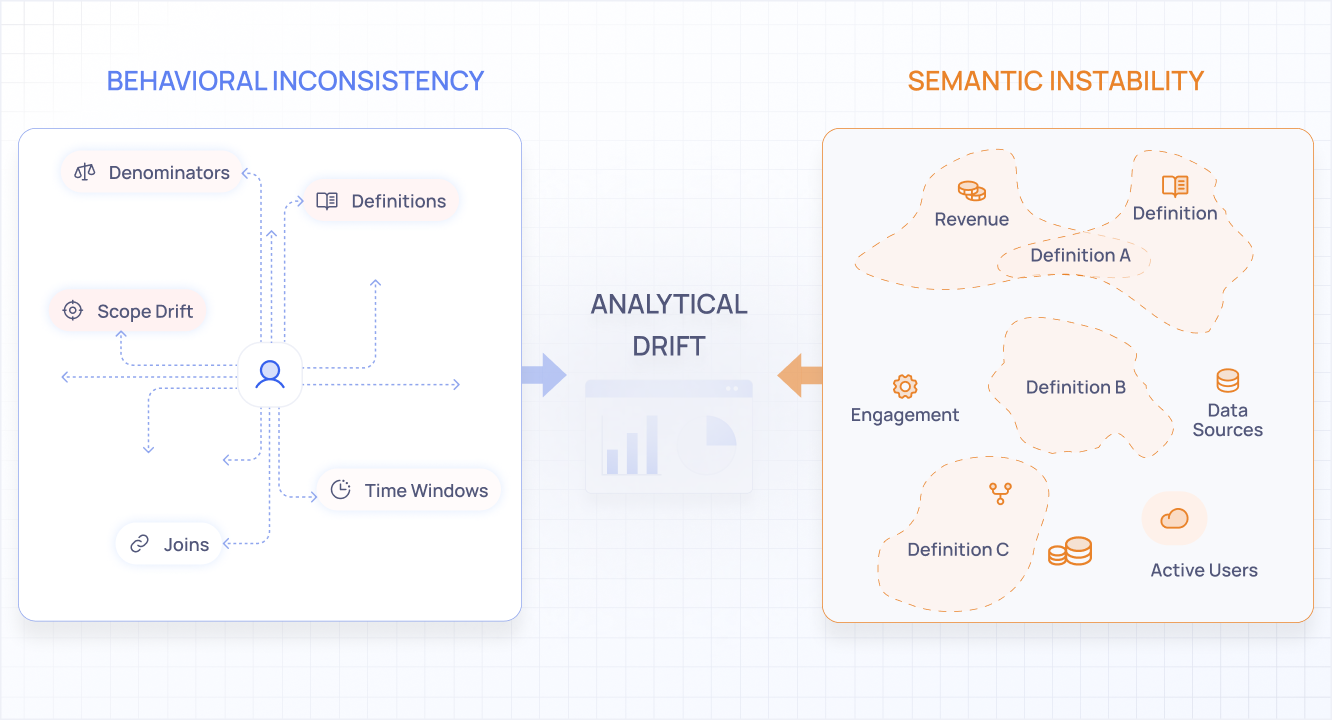 As a result, the same metric label can quietly refer to different populations or calculations across analyses.