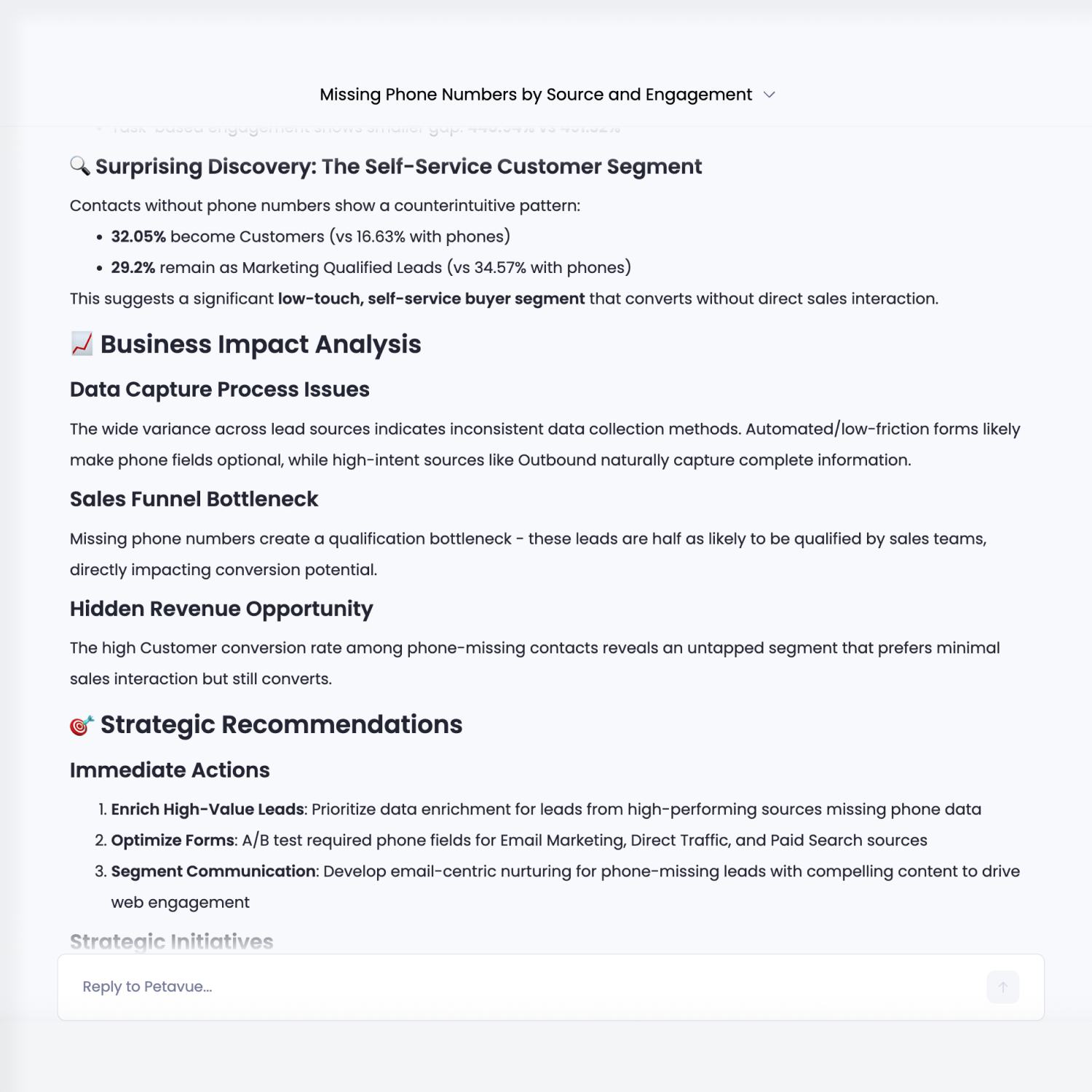 The request asked Petavue to measure phone-number completeness, break missing data down by contact source, and evaluate whether missing phone numbers correlate with low engagement or unqualified outcomes.Petavue interprets the intent behind the question—understanding how contactability gaps influence sales effectiveness and lead progression.